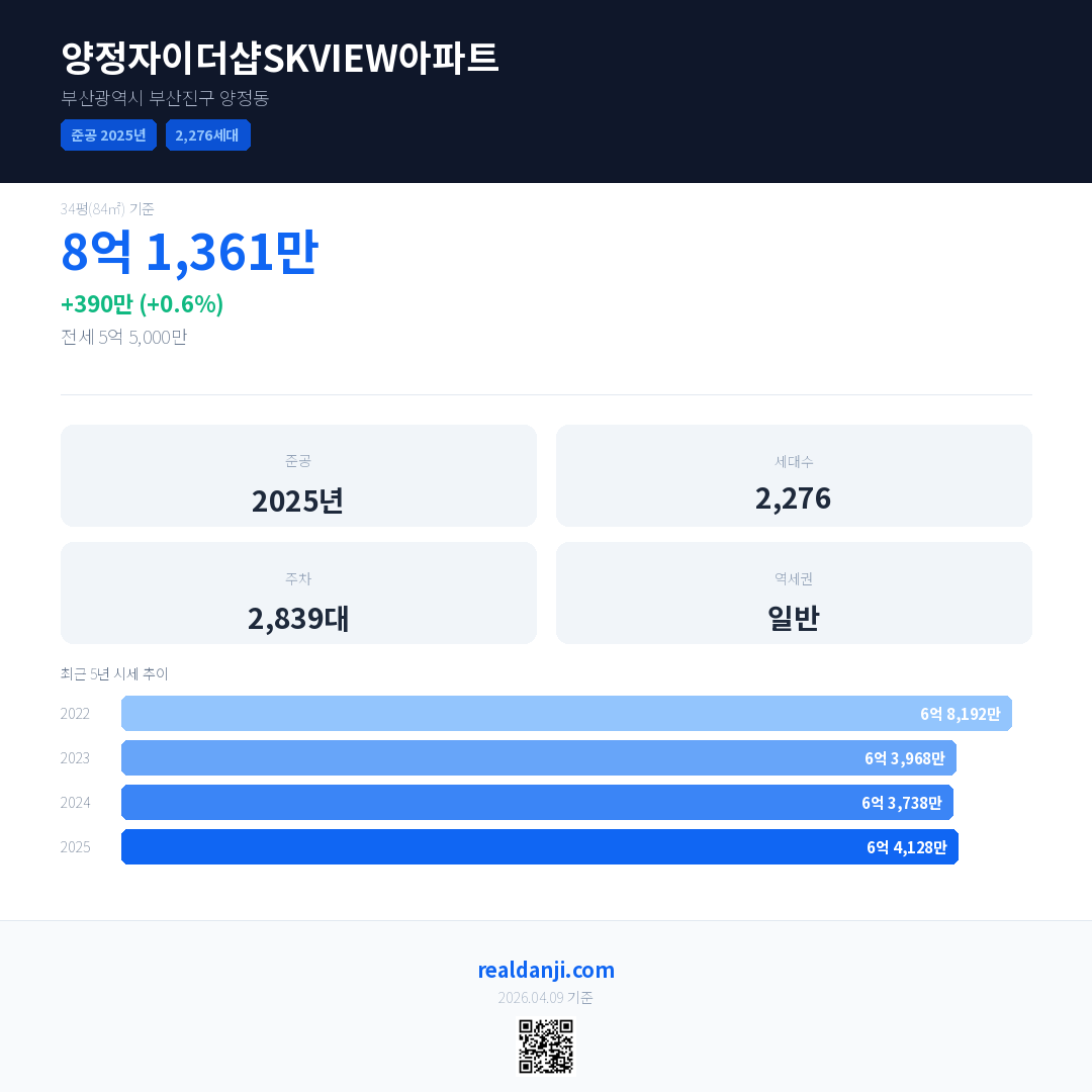 양정자이더샵SKVIEW아파트 국민평형 기준 2025년 평균 거래가는 6억 4,128만으로, 전년 대비 0.6% 상승 했습니다.
