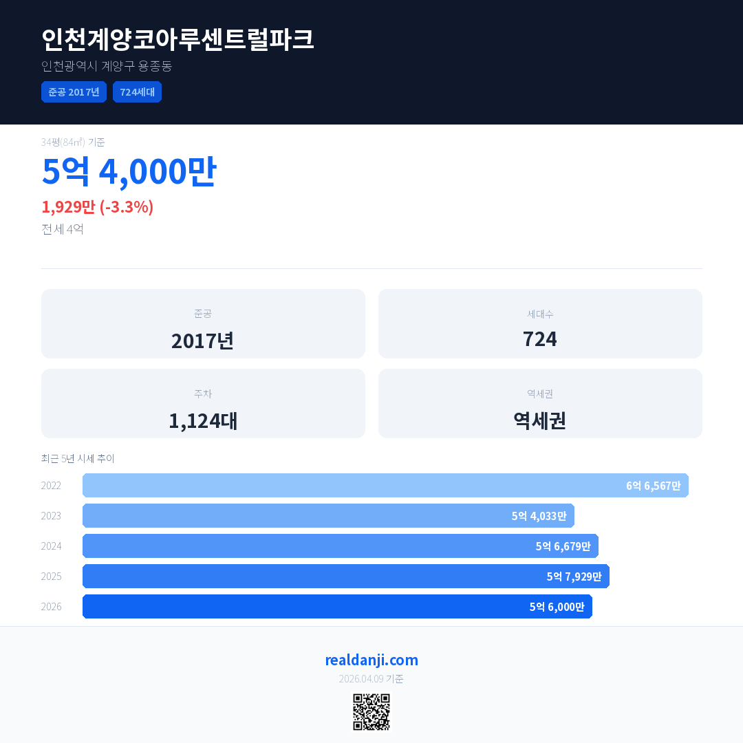 인천계양코아루센트럴파크 국민평형 기준 2026년 평균 거래가는 5억 6,000만으로, 전년 대비 3.3% 하락 했습니다.