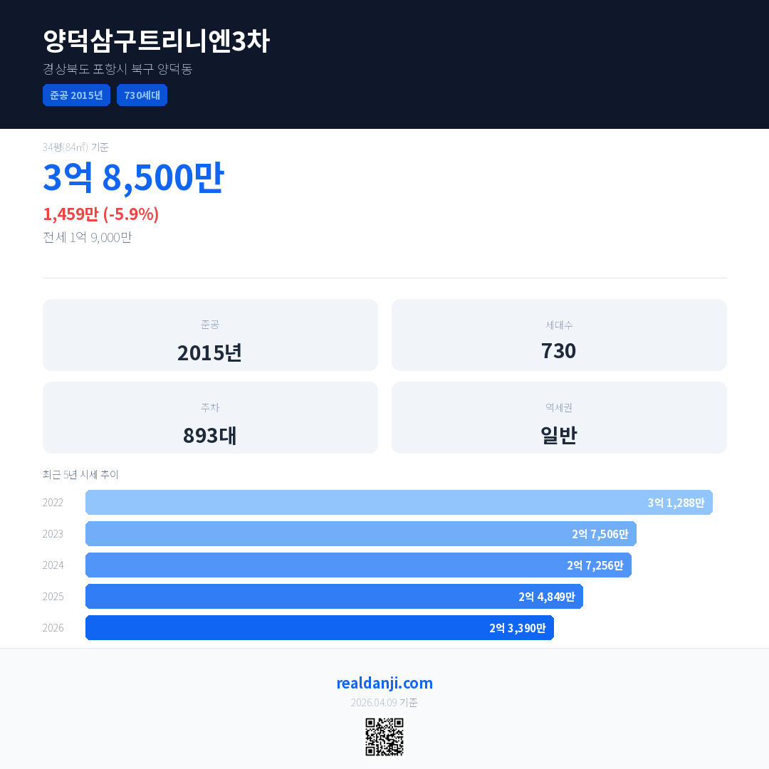 양덕삼구트리니엔3차 최근 거래가는 3억 8,500만입니다. (2026-03)