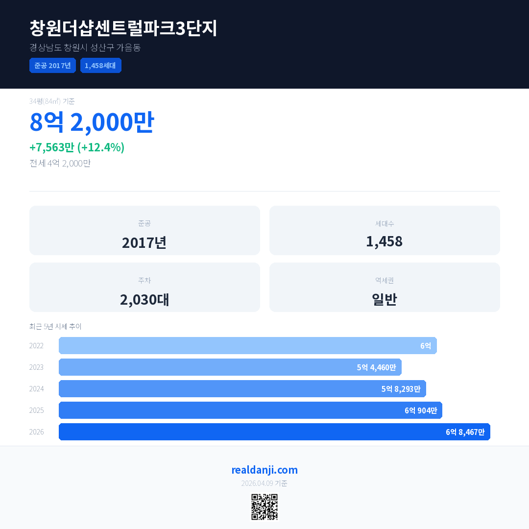 창원더샵센트럴파크3단지 최근 거래가는 8억 2,000만입니다. (2026-03)