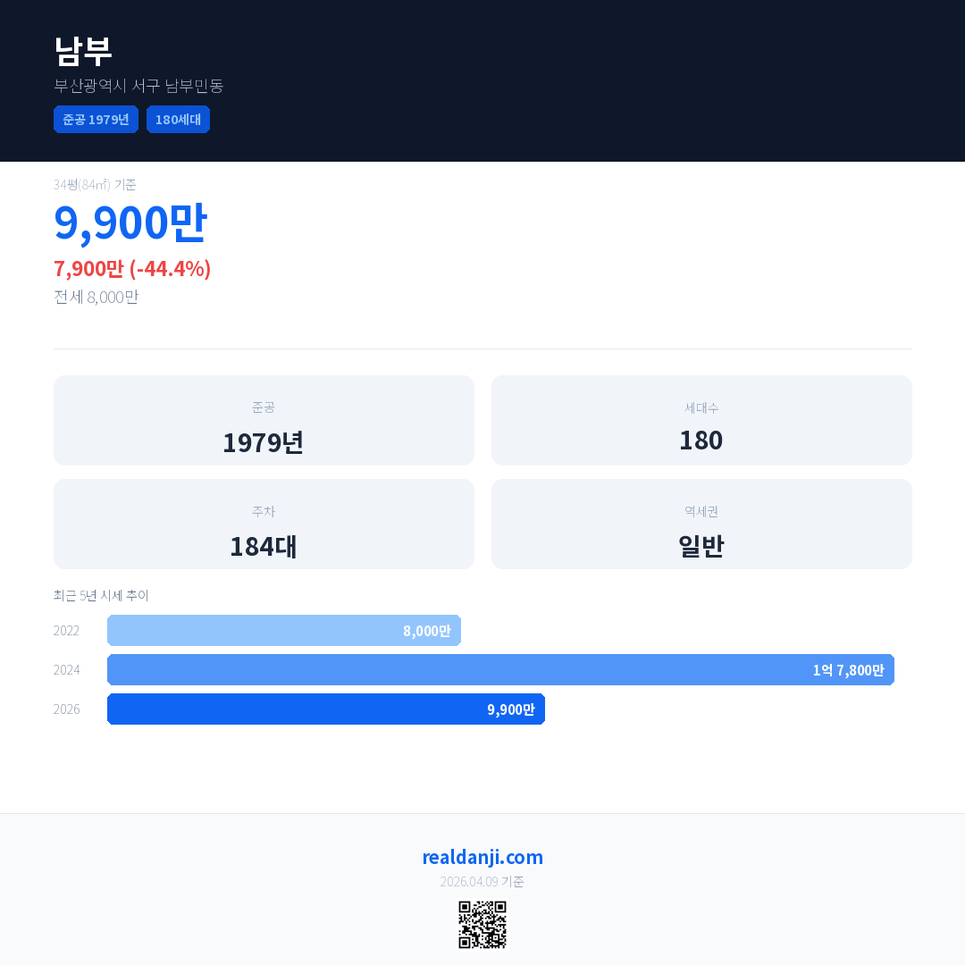 남부은(는) 1979년에 준공되었으며, 현재 47년차입니다. 총 180세대 규모입니다.