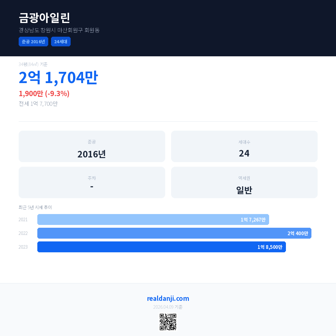금광아일린은(는) 2016년에 준공되었으며, 현재 10년차입니다. 총 24세대 규모입니다.