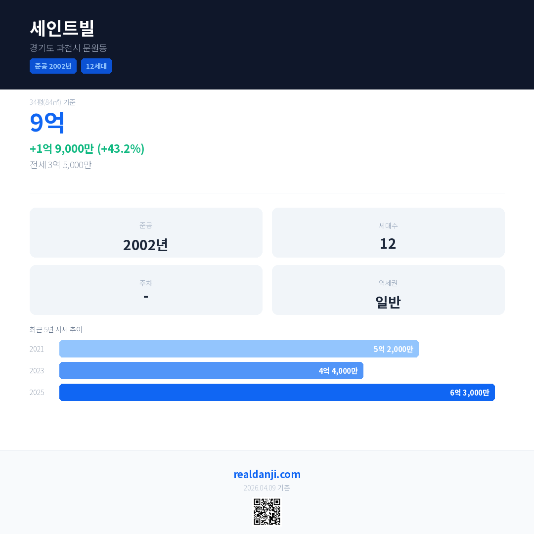 세인트빌 국민평형 기준 2025년 평균 거래가는 6억 3,000만으로, 전년 대비 43.2% 상승 했습니다.