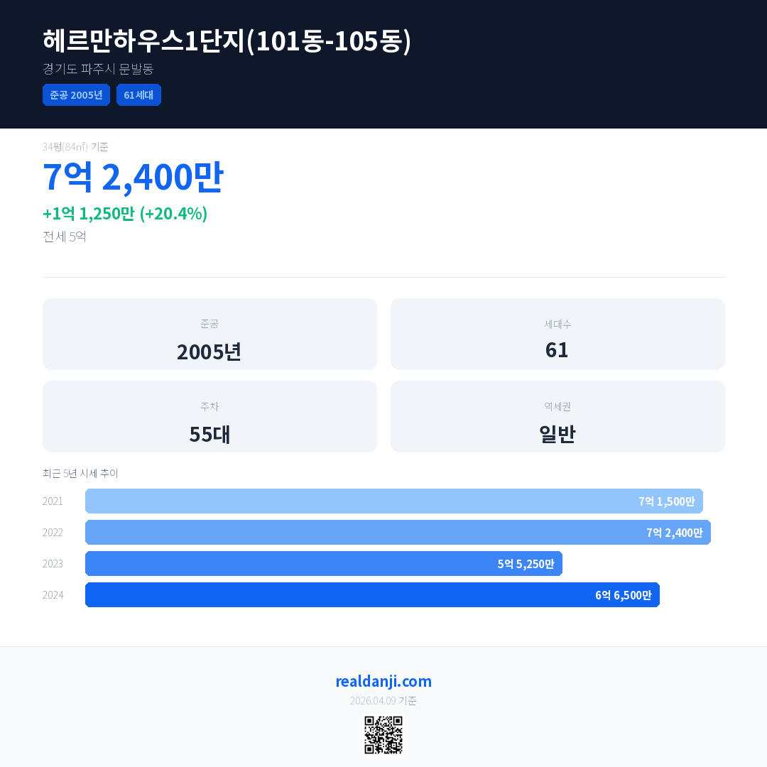 헤르만하우스1단지(101동-105동) 국민평형 기준 2024년 평균 거래가는 6억 6,500만으로, 전년 대비 20.4% 상승 했습니다.