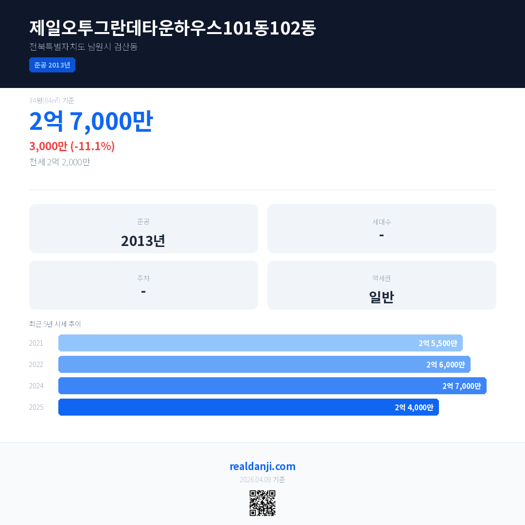 제일오투그란데타운하우스101동102동 최근 거래가는 2억 7,000만입니다. (2025-11)