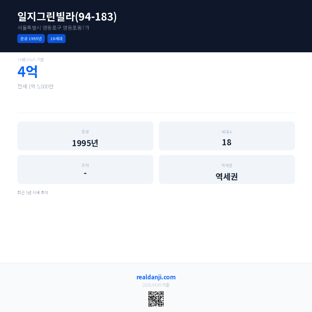 일지그린빌라(94-183)은(는) 1995년에 준공되었으며, 현재 31년차입니다. 총 18세대 규모입니다.