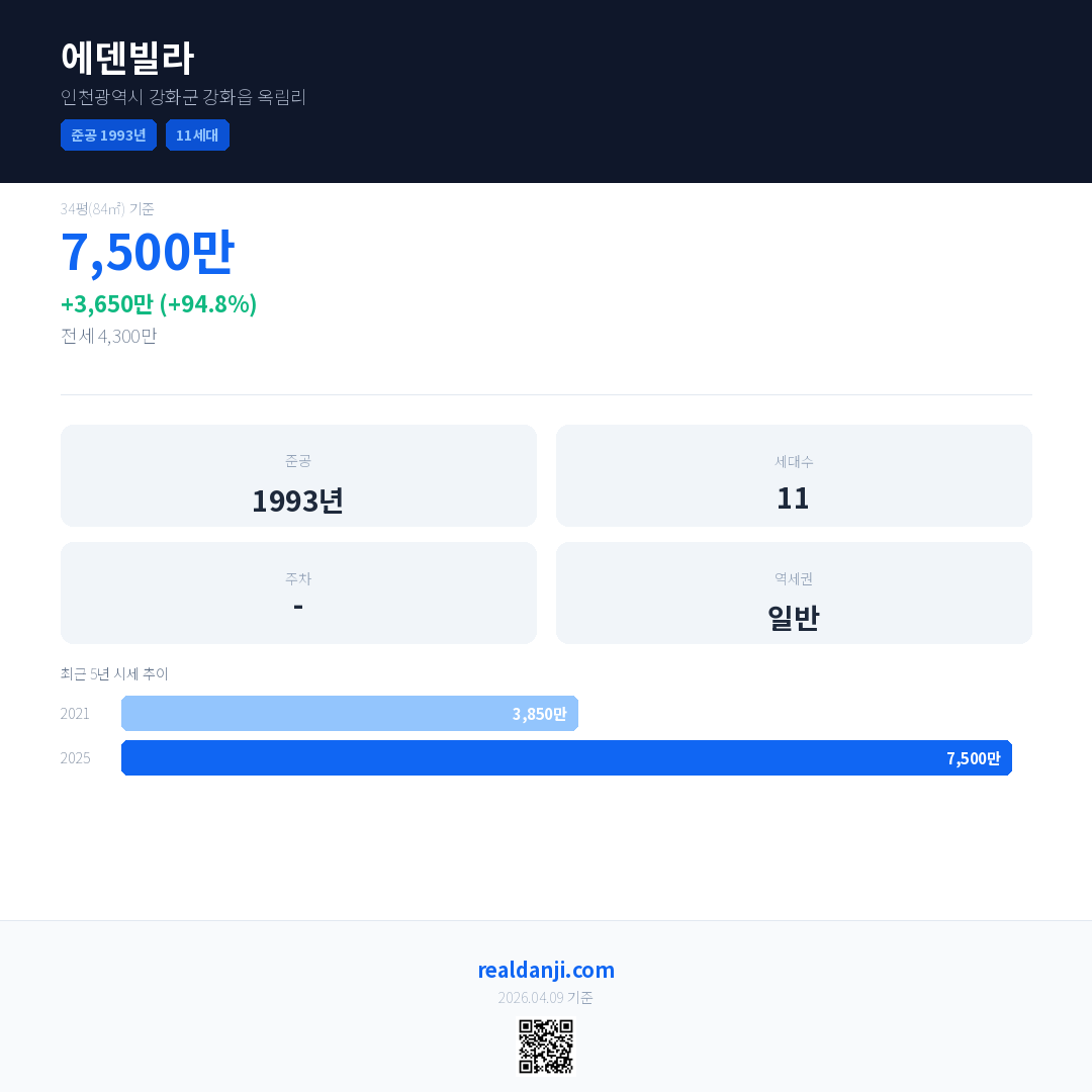 에덴빌라 국민평형 기준 2025년 평균 거래가는 7,500만으로, 전년 대비 94.8% 상승 했습니다.