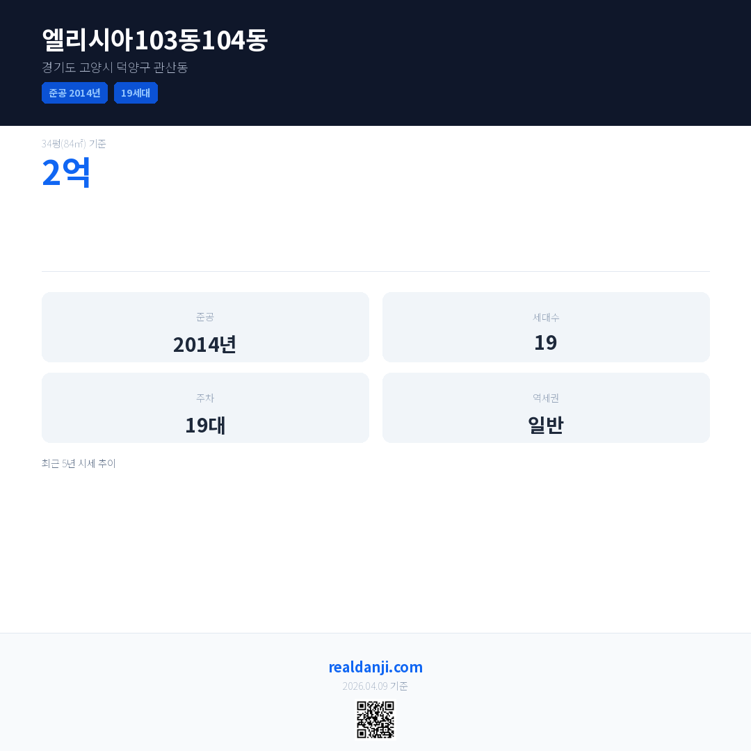 엘리시아103동104동 최근 거래가는 2억입니다. (2019-09)