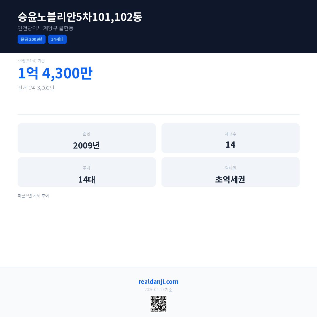 승윤노블리안5차101,102동은(는) 2009년에 준공되었으며, 현재 17년차입니다. 총 14세대 규모입니다.