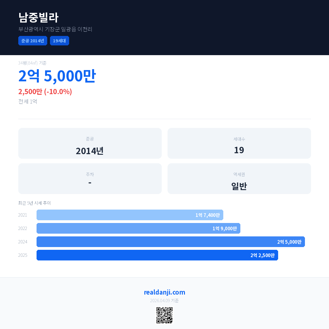 남중빌라 국민평형 기준 2025년 평균 거래가는 2억 2,500만으로, 전년 대비 10.0% 하락 했습니다.