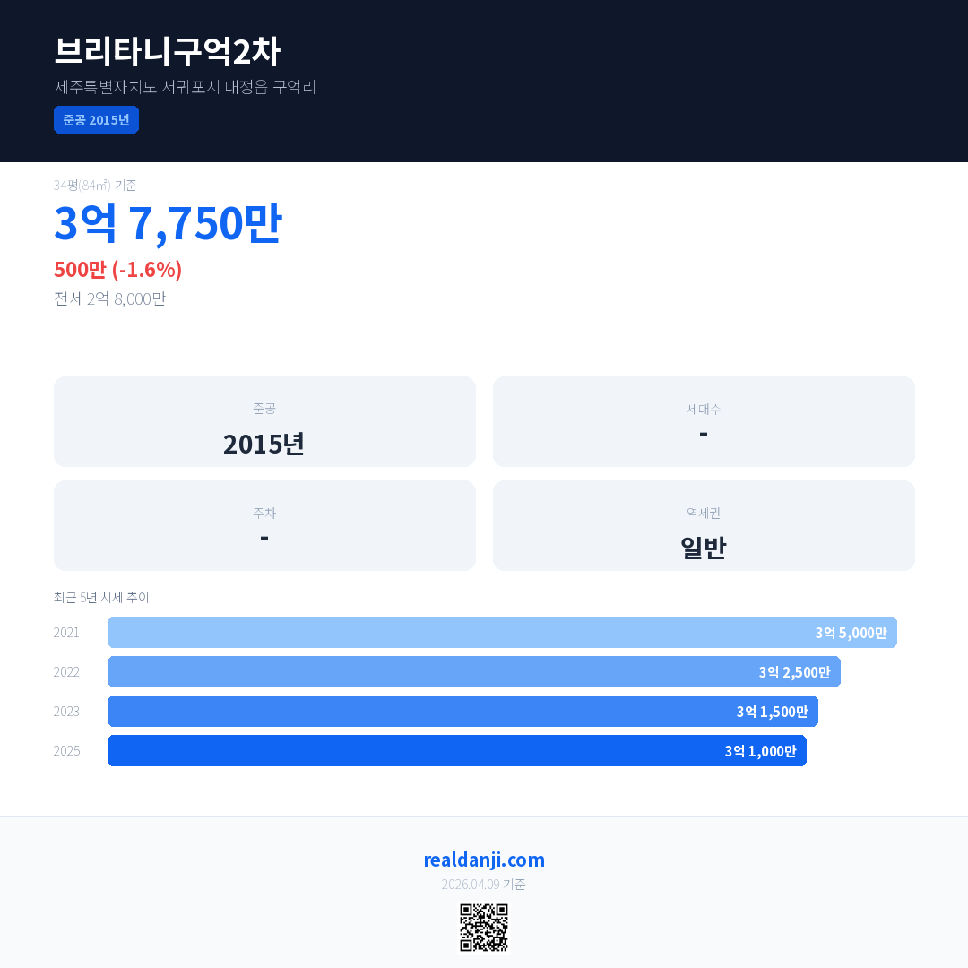 브리타니구억2차 국민평형 기준 2025년 평균 거래가는 3억 1,000만으로, 전년 대비 1.6% 하락 했습니다.