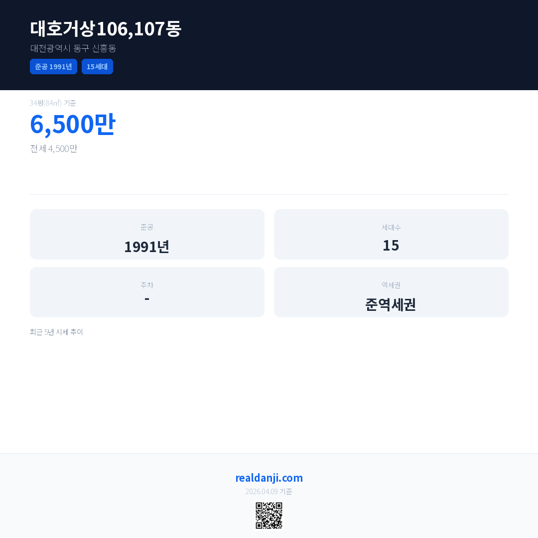 대호거상106,107동은(는) 1991년에 준공되었으며, 현재 35년차입니다. 총 15세대 규모입니다.