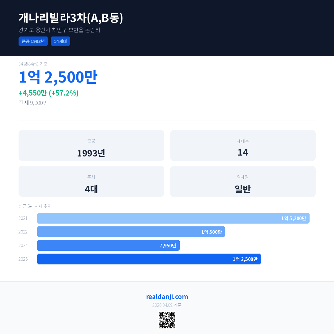 개나리빌라3차(A,B동) 국민평형 기준 2025년 평균 거래가는 1억 2,500만으로, 전년 대비 57.2% 상승 했습니다.