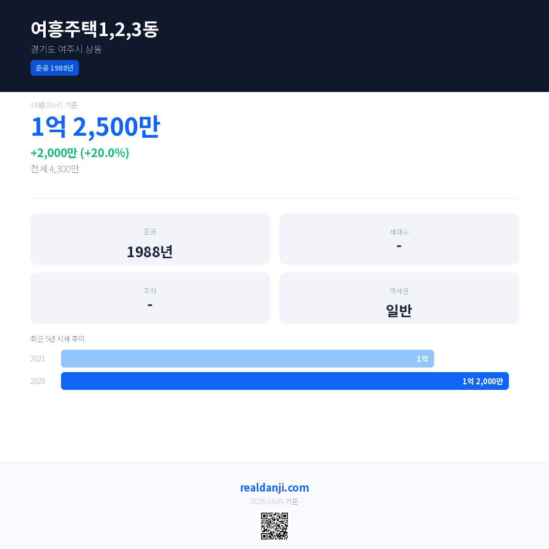 여흥주택1,2,3동 국민평형 기준 2023년 평균 거래가는 1억 2,000만으로, 전년 대비 20.0% 상승 했습니다.