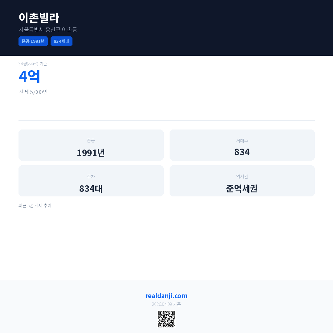 이촌빌라은(는) 1991년에 준공되었으며, 현재 35년차입니다. 총 834세대 규모입니다.