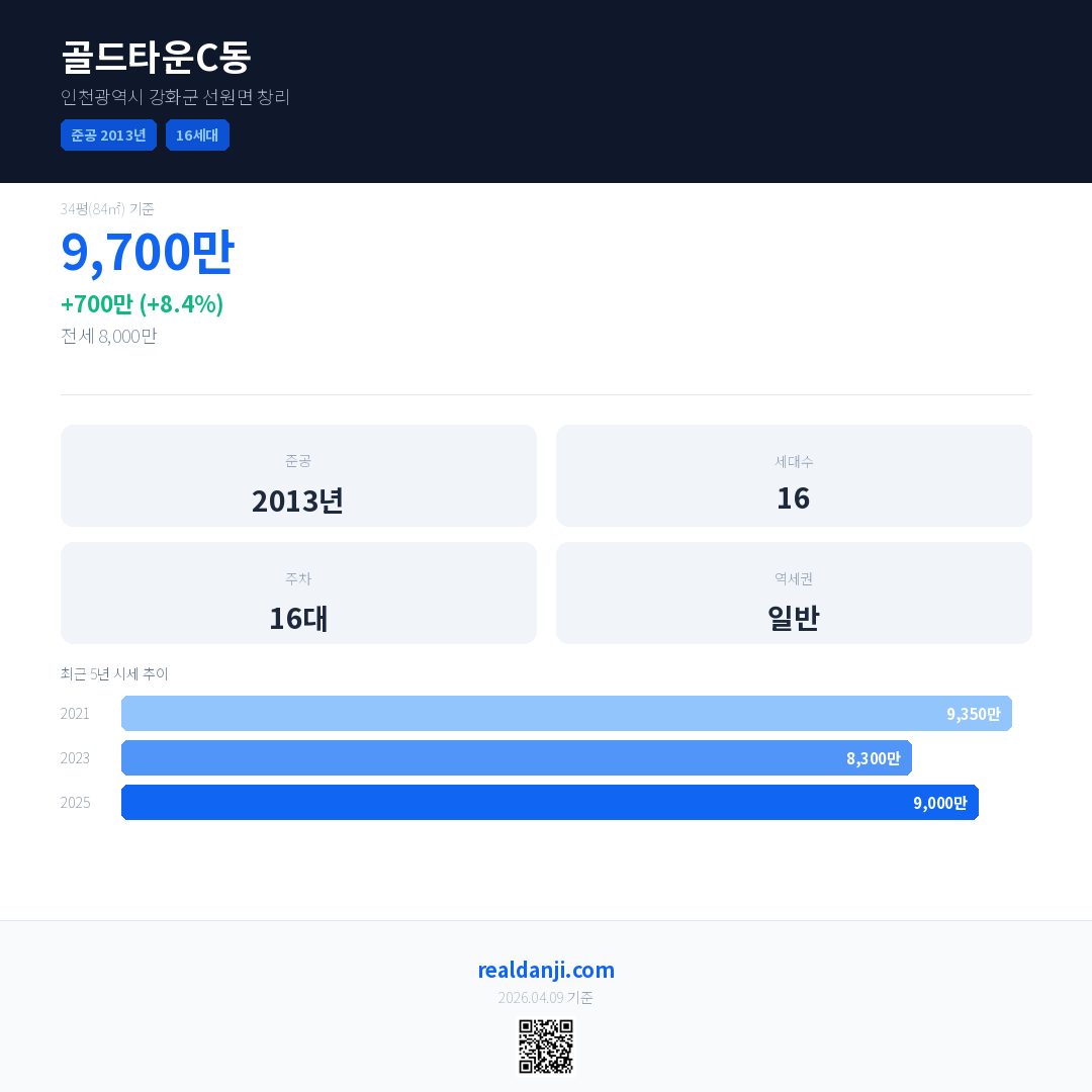 골드타운C동은(는) 2013년에 준공되었으며, 현재 13년차입니다. 총 16세대 규모입니다.