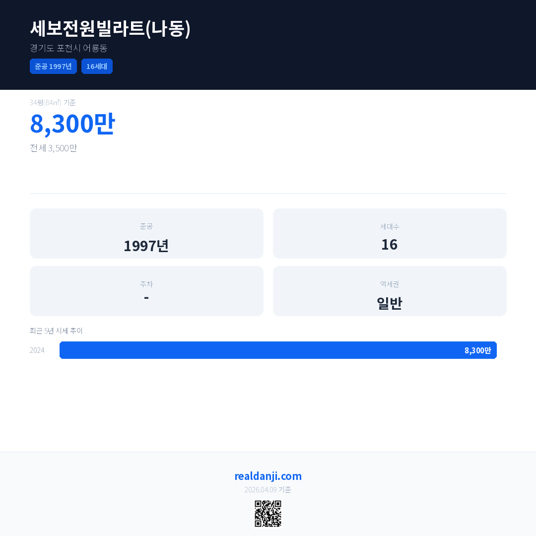 세보전원빌라트(나동) 최근 거래가는 8,300만입니다. (2025-02)