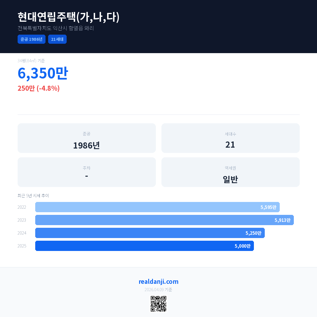 현대연립주택(가,나,다) 국민평형 기준 2025년 평균 거래가는 5,000만으로, 전년 대비 4.8% 하락 했습니다.