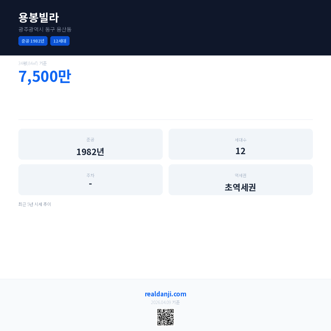 용봉빌라 국민평형 기준 2018년 평균 거래가는 7,500만으로, 전년 대비 0.0% 하락 했습니다.