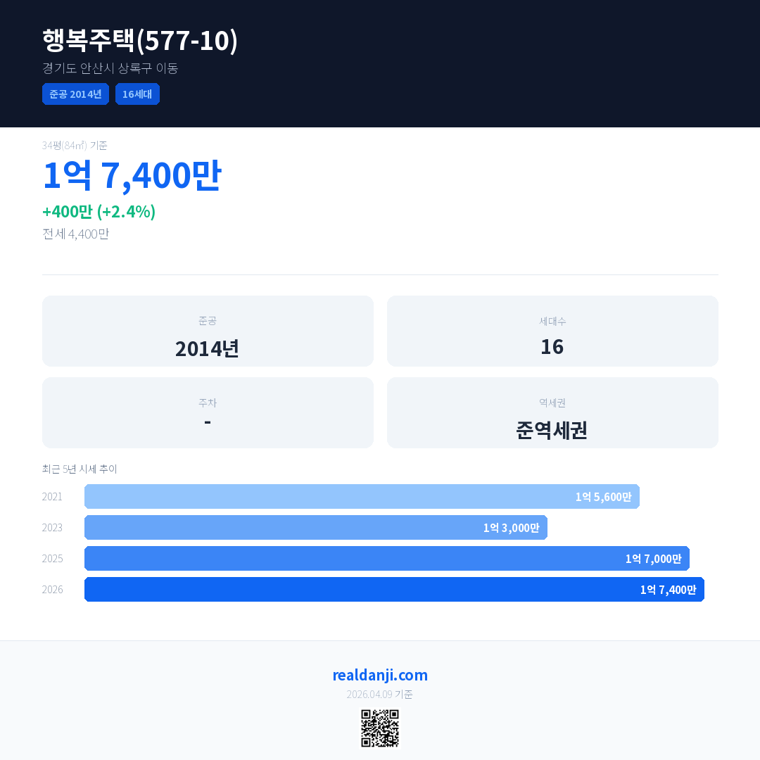 행복주택(577-10) 국민평형 기준 2026년 평균 거래가는 1억 7,400만으로, 전년 대비 2.4% 상승 했습니다.