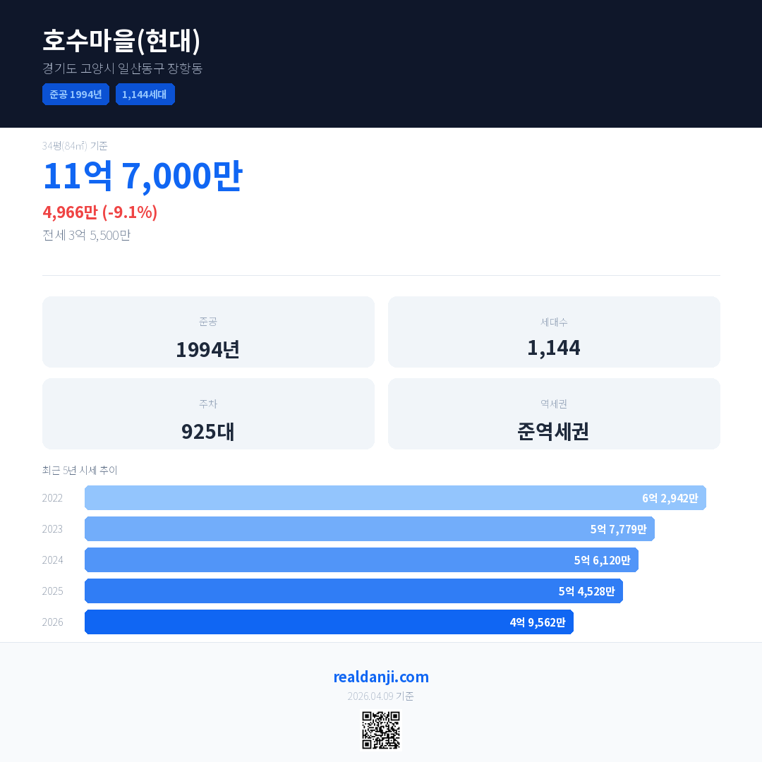 호수마을(현대) 최근 거래가는 11억 7,000만입니다. (2026-03)