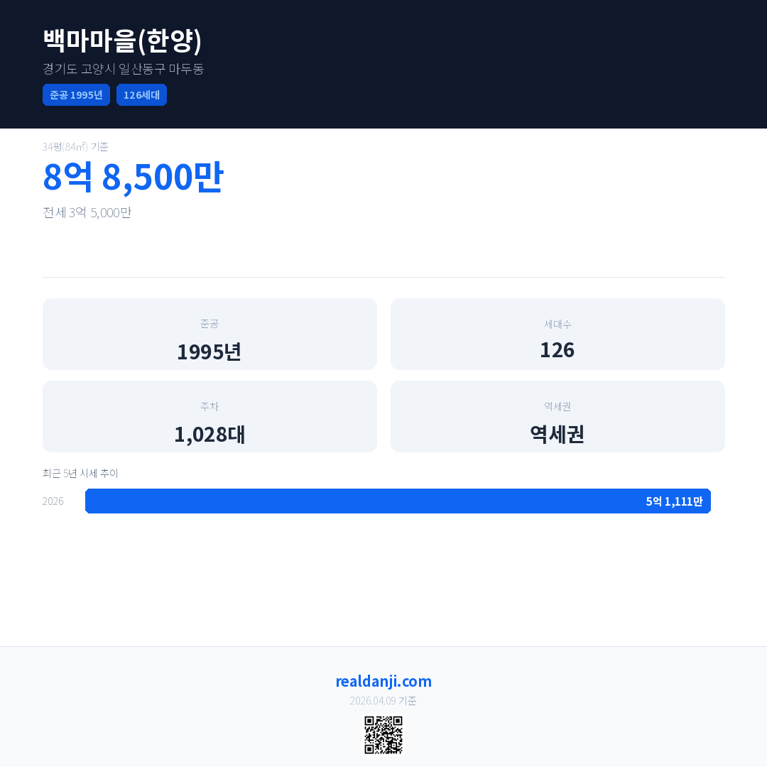 백마마을(한양) 국민평형 기준 2026년 평균 거래가는 5억 1,111만으로, 전년 대비 36.5% 상승 했습니다.