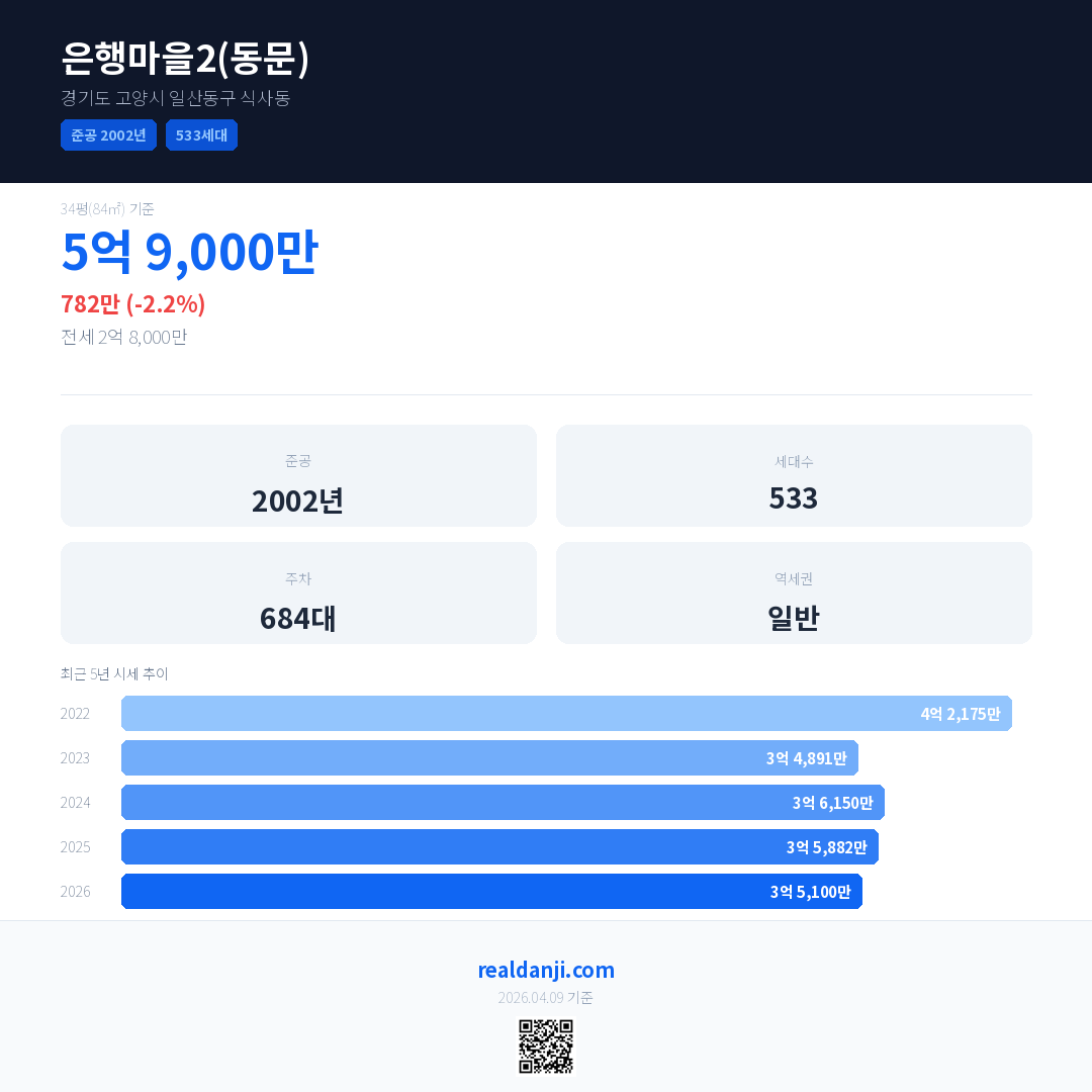 은행마을2(동문) 국민평형 기준 2026년 평균 거래가는 3억 5,100만으로, 전년 대비 2.2% 하락 했습니다.