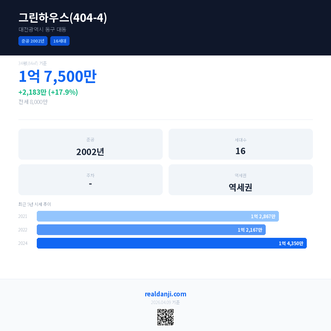 그린하우스(404-4) 국민평형 기준 2024년 평균 거래가는 1억 4,350만으로, 전년 대비 17.9% 상승 했습니다.