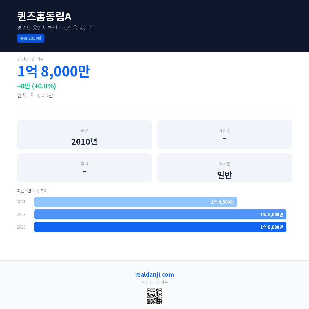 퀸즈홈동림A 국민평형 기준 2026년 평균 거래가는 1억 8,000만으로, 전년 대비 0.0% 하락 했습니다.