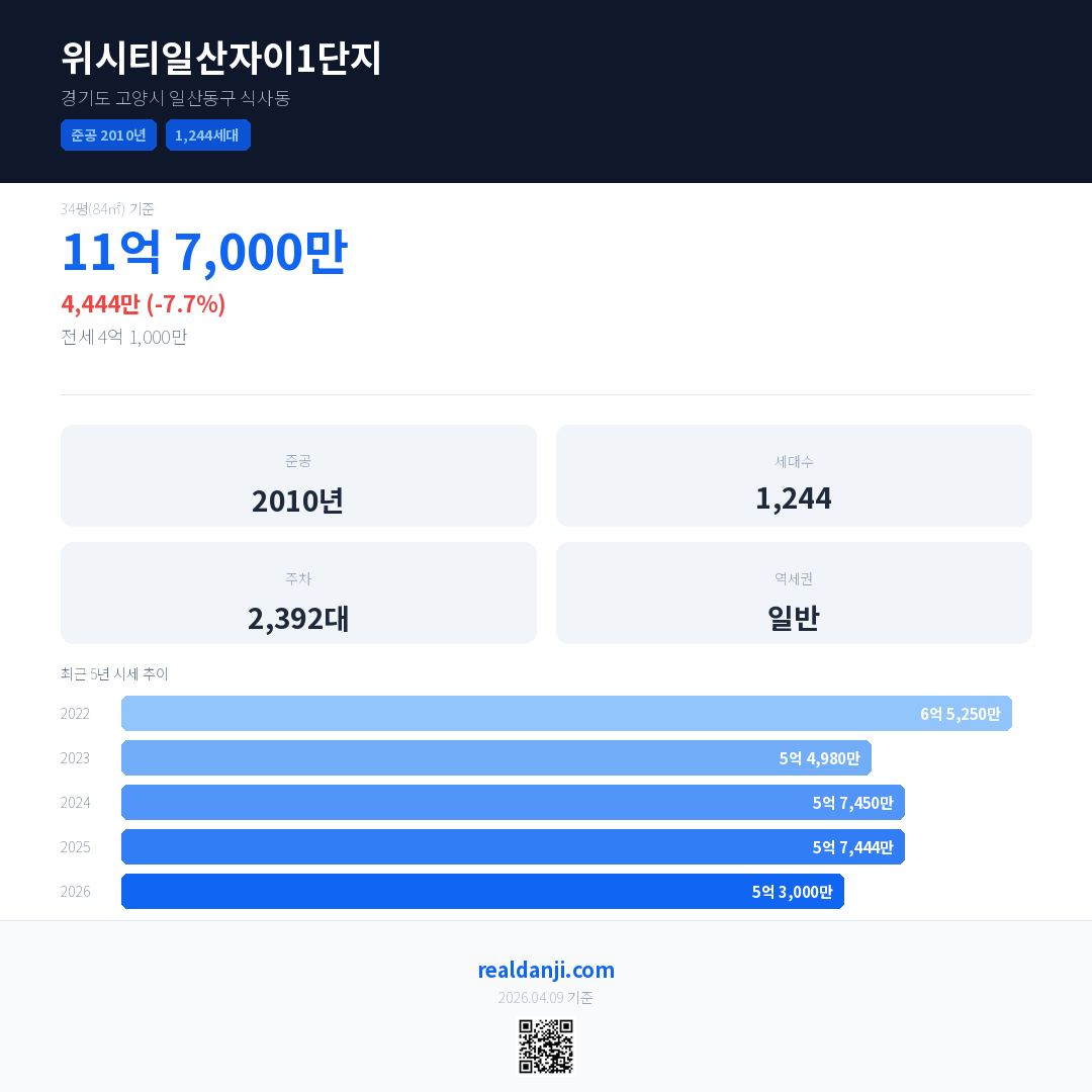 위시티일산자이1단지 최근 거래가는 11억 7,000만입니다. (2026-03)
