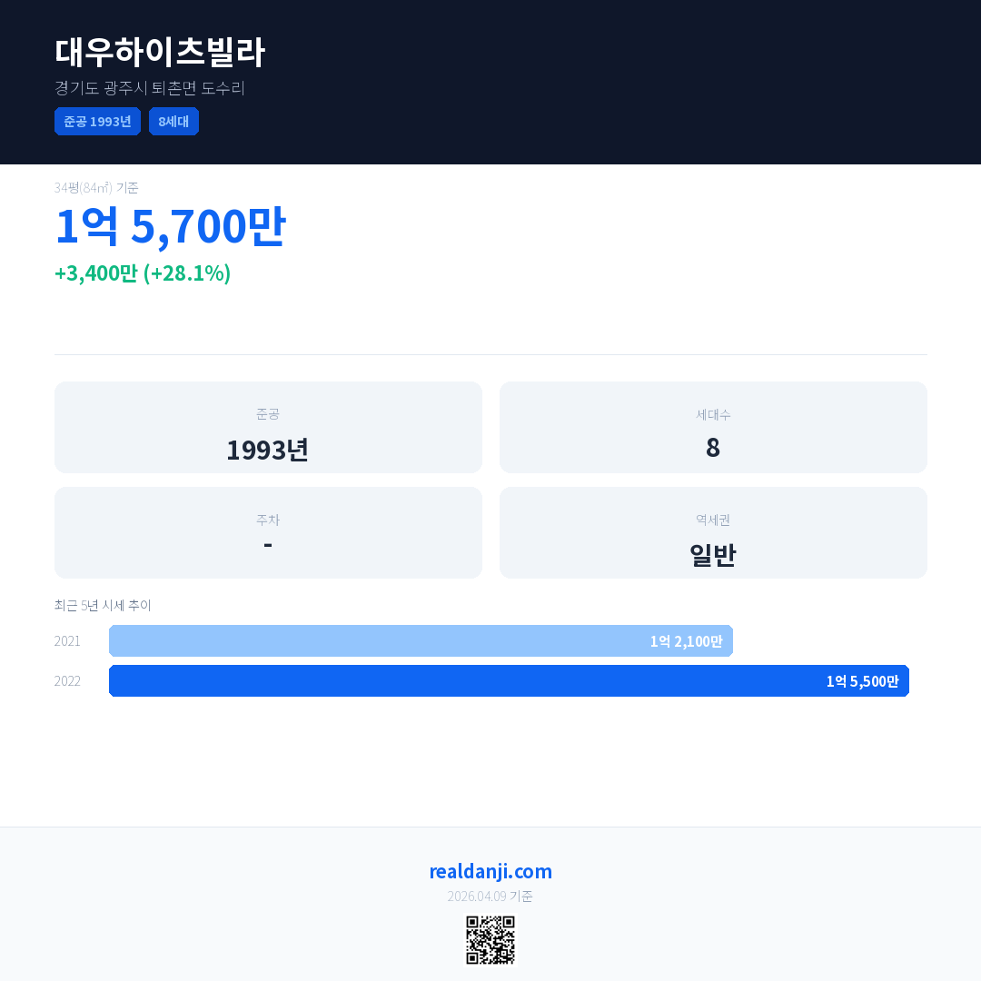 대우하이츠빌라 국민평형 기준 2022년 평균 거래가는 1억 5,500만으로, 전년 대비 28.1% 상승 했습니다.
