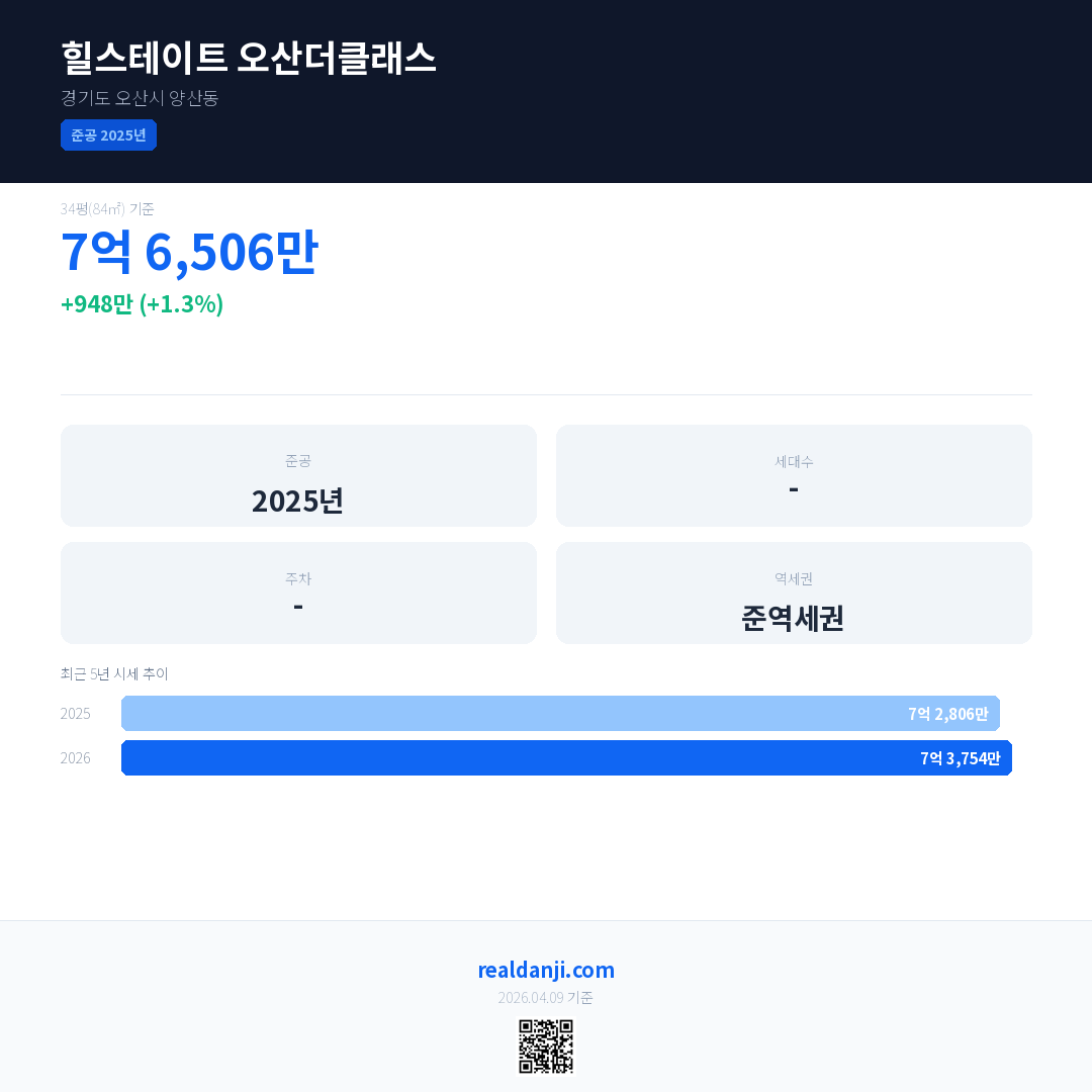 힐스테이트 오산더클래스 국민평형 기준 2026년 평균 거래가는 7억 3,754만으로, 전년 대비 1.3% 상승 했습니다.