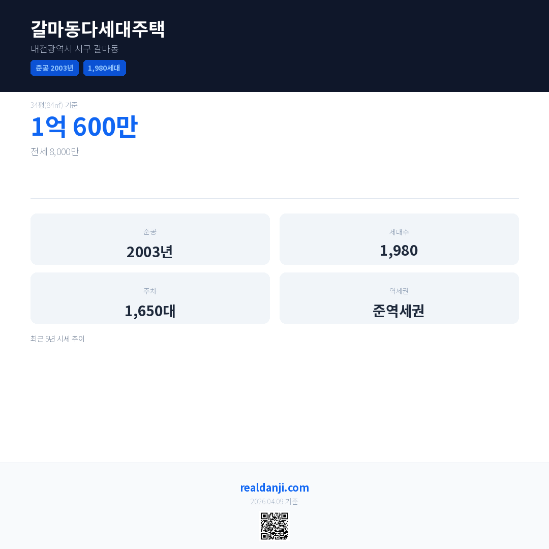 갈마동다세대주택은(는) 2003년에 준공되었으며, 현재 23년차입니다. 총 1,980세대 규모입니다.
