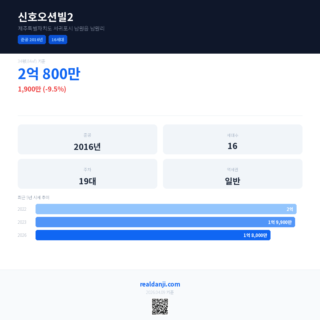 신호오션빌2 국민평형 기준 2026년 평균 거래가는 1억 8,000만으로, 전년 대비 9.5% 하락 했습니다.