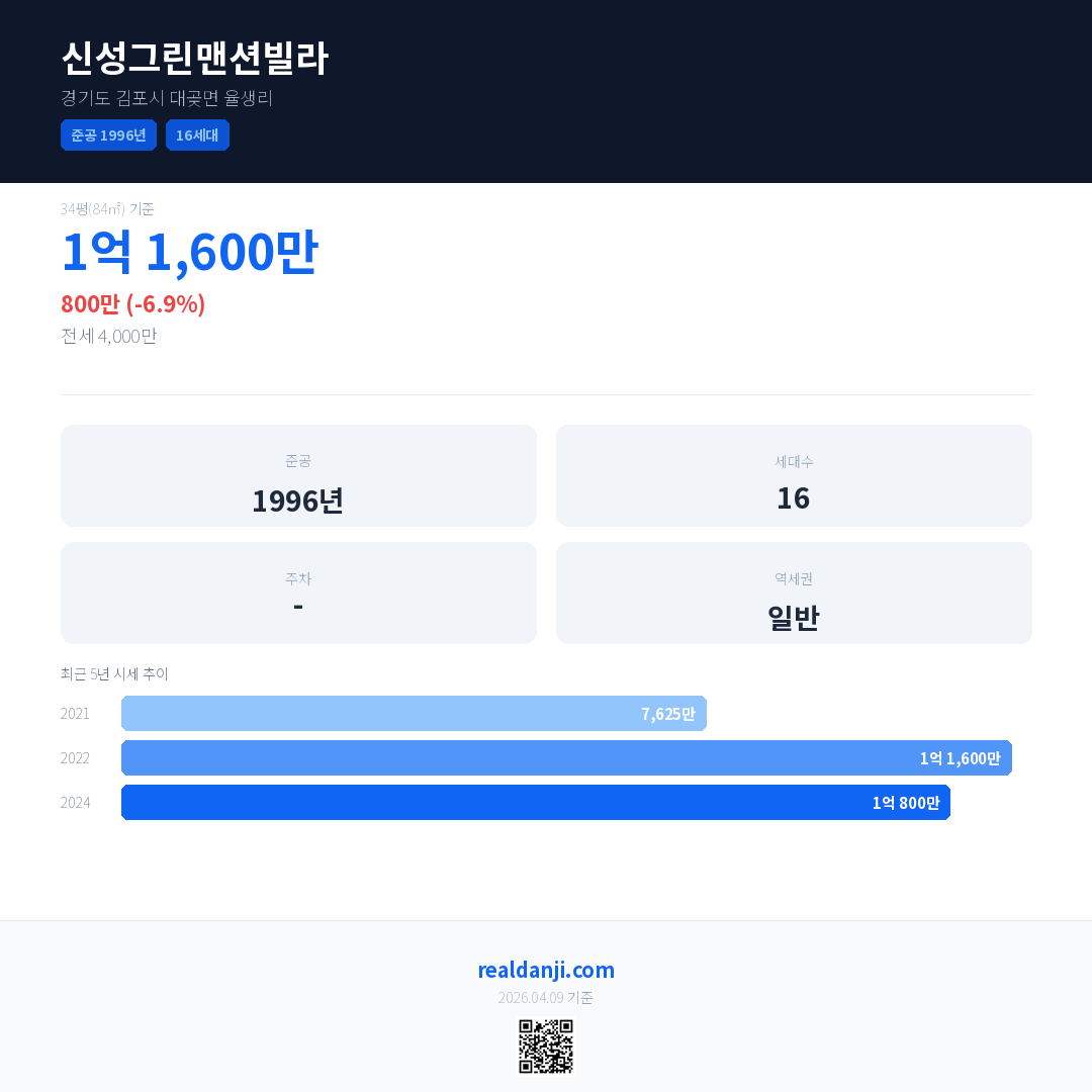 신성그린맨션빌라 최근 거래가는 1억 1,600만입니다. (2024-06)