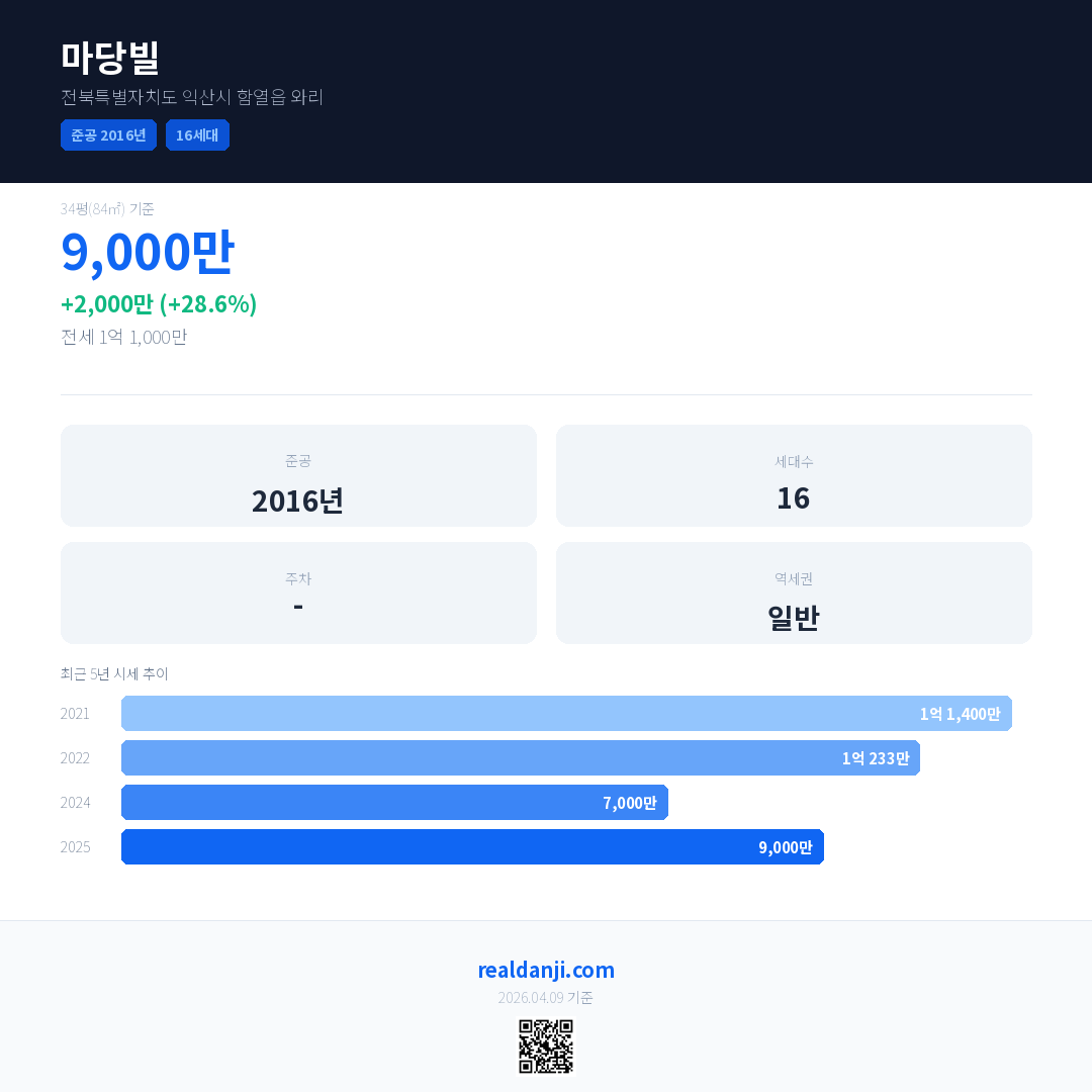 마당빌 국민평형 기준 2025년 평균 거래가는 9,000만으로, 전년 대비 28.6% 상승 했습니다.