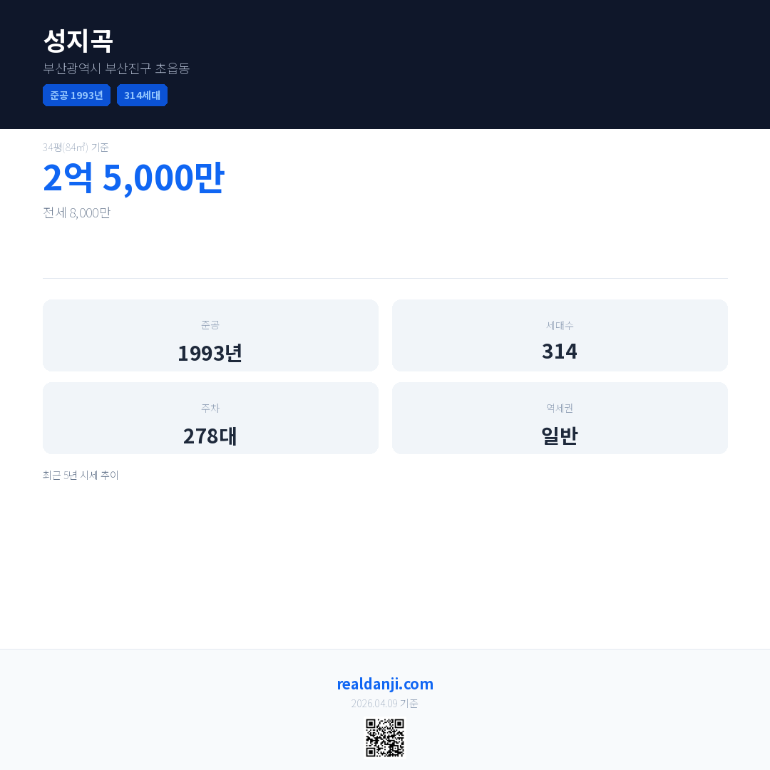 성지곡은(는) 1993년에 준공되었으며, 현재 33년차입니다. 총 314세대 규모입니다.