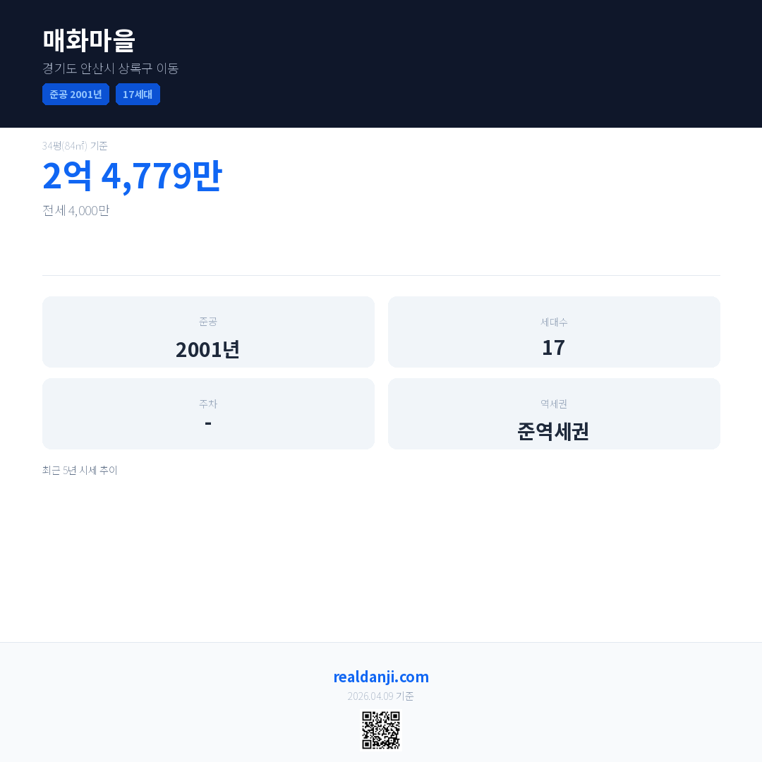 매화마을은(는) 2001년에 준공되었으며, 현재 25년차입니다. 총 17세대 규모입니다.