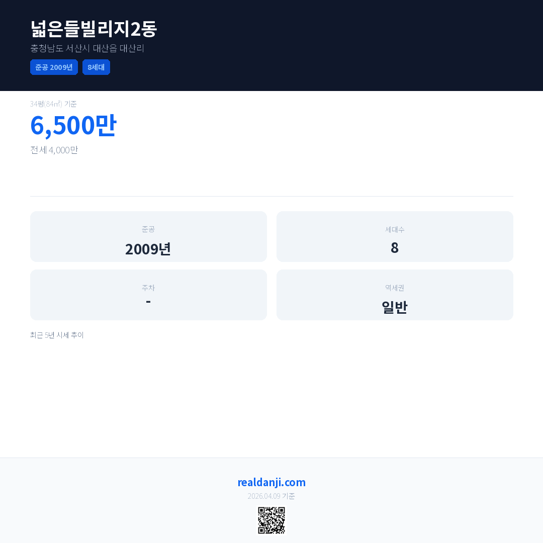 넓은들빌리지2동은(는) 2009년에 준공되었으며, 현재 17년차입니다. 총 8세대 규모입니다.