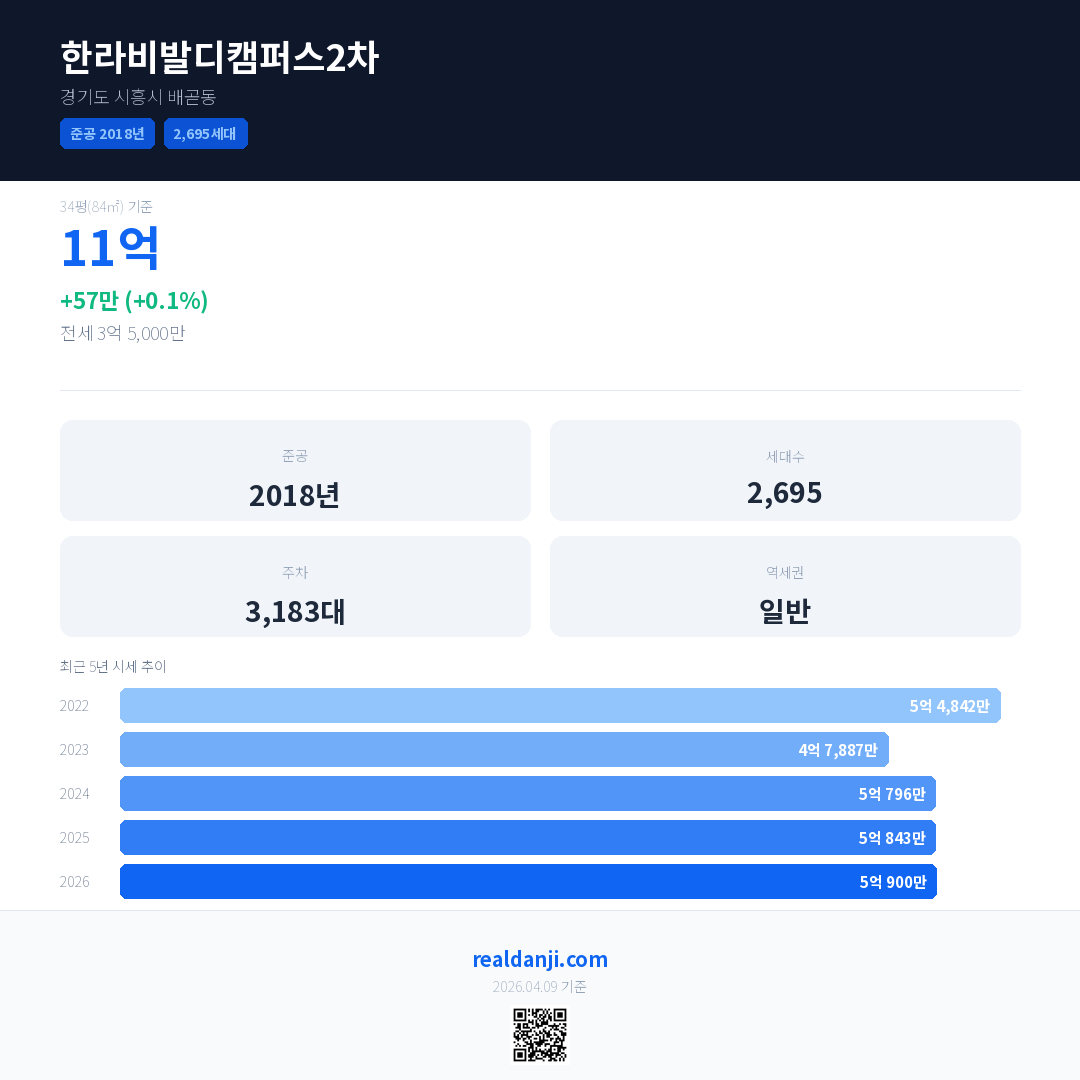 한라비발디캠퍼스2차 국민평형 기준 2026년 평균 거래가는 5억 900만으로, 전년 대비 0.1% 상승 했습니다.