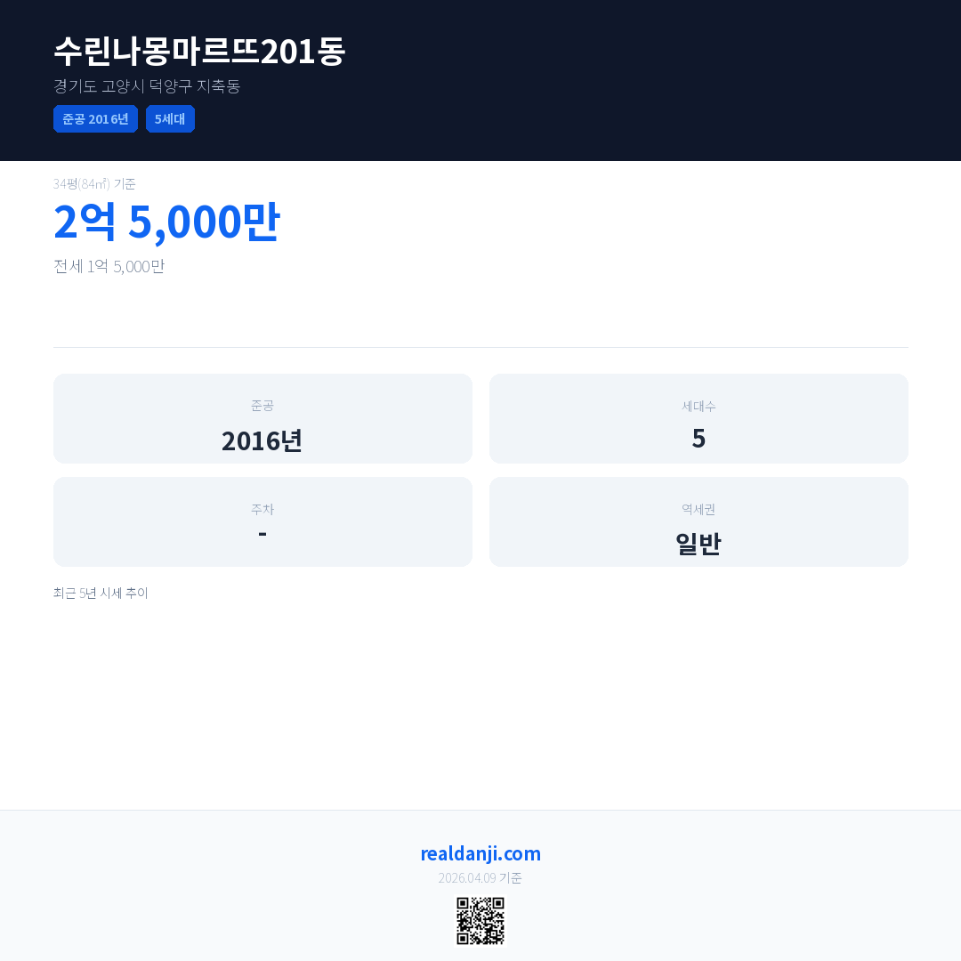수린나몽마르뜨201동은(는) 2016년에 준공되었으며, 현재 10년차입니다. 총 5세대 규모입니다.
