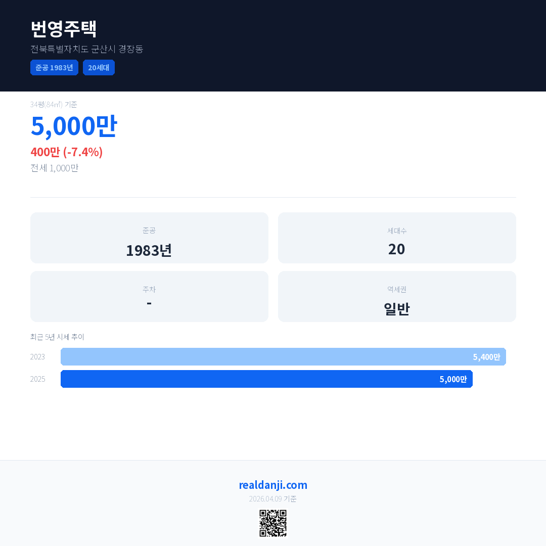 번영주택 국민평형 기준 2025년 평균 거래가는 5,000만으로, 전년 대비 7.4% 하락 했습니다.