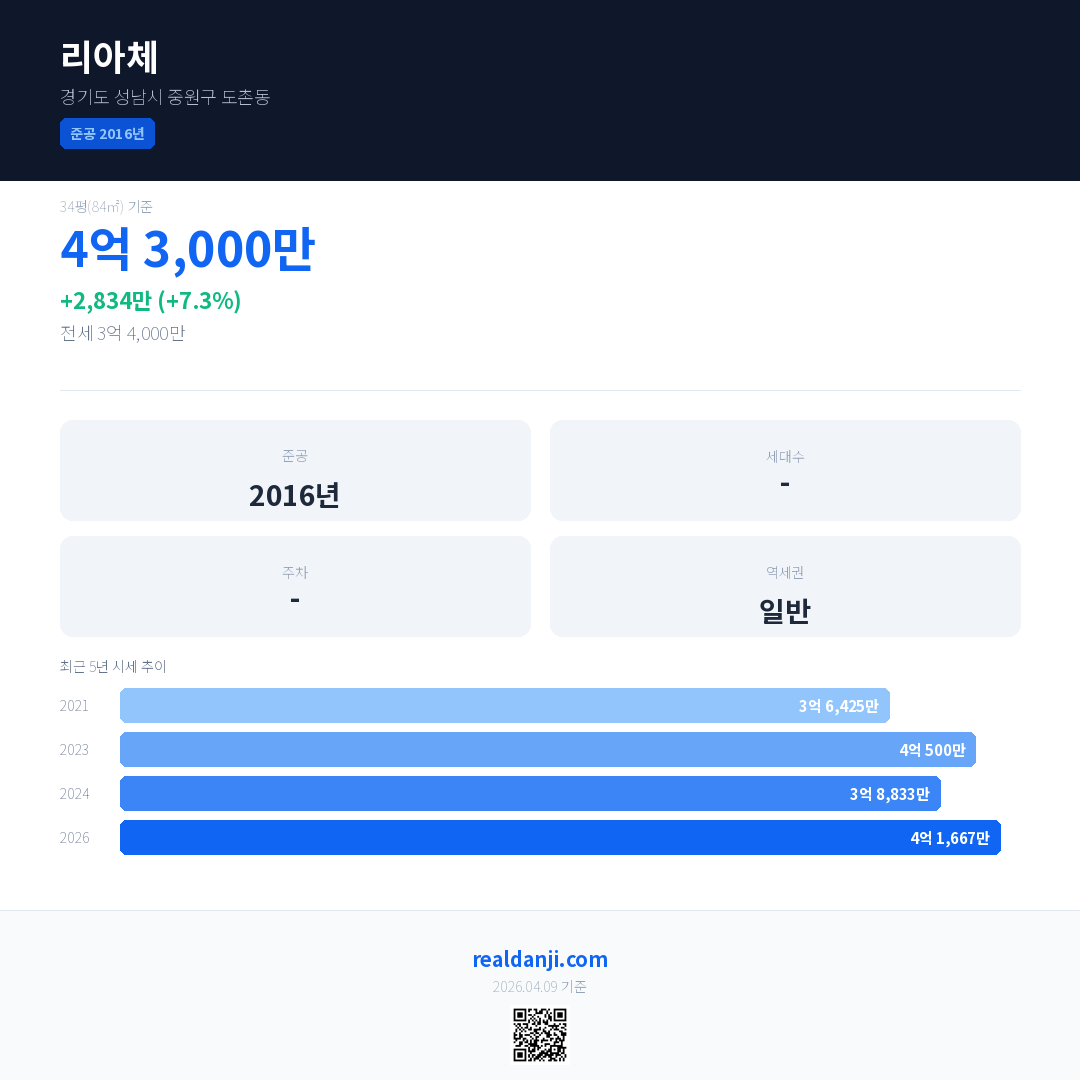 리아체 국민평형 기준 2026년 평균 거래가는 4억 1,667만으로, 전년 대비 7.3% 상승 했습니다.