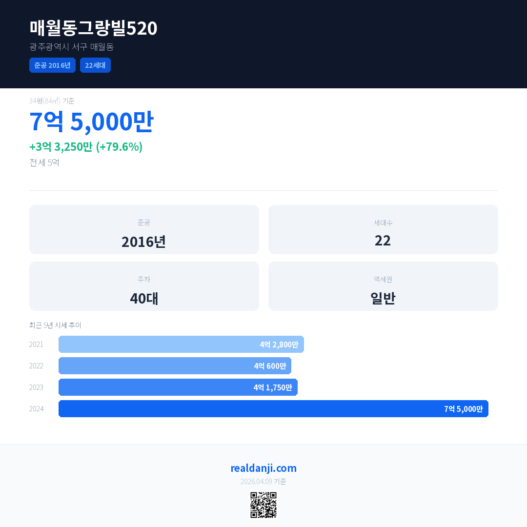매월동그랑빌520은(는) 2016년에 준공되었으며, 현재 10년차입니다. 총 22세대 규모입니다.