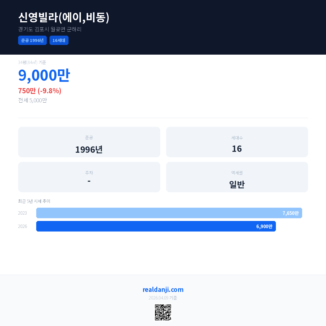 신영빌라(에이,비동) 최근 거래가는 9,000만입니다. (2026-03)