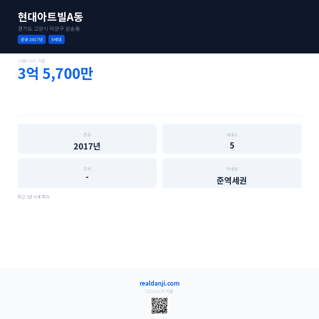현대아트빌A동은(는) 2017년에 준공되었으며, 현재 9년차입니다. 총 5세대 규모입니다.