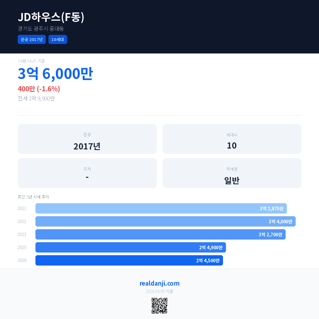 JD하우스(F동) 최근 거래가는 3억 6,000만입니다. (2026-01)