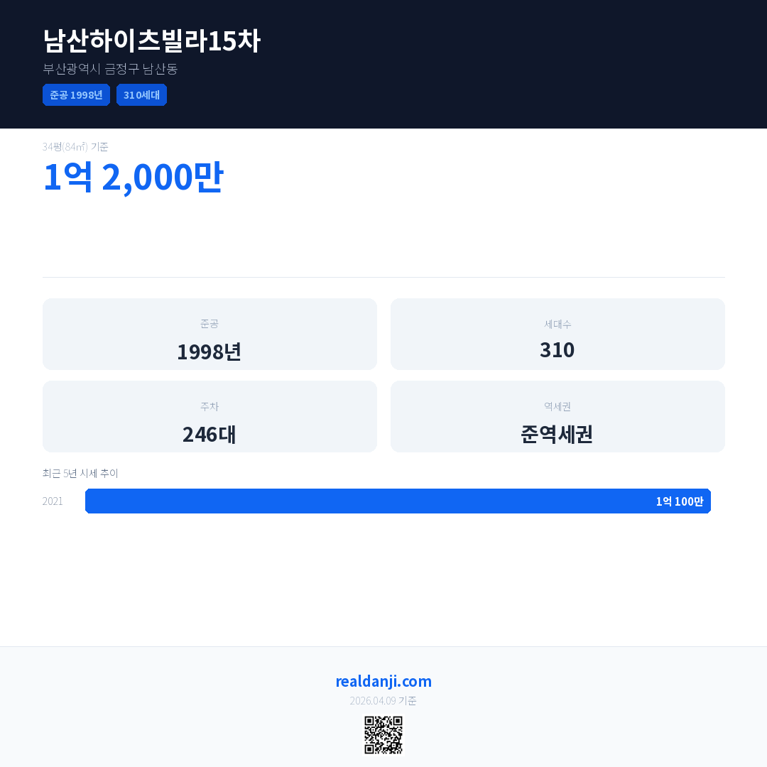 남산하이츠빌라15차은(는) 1998년에 준공되었으며, 현재 28년차입니다. 총 310세대 규모입니다.