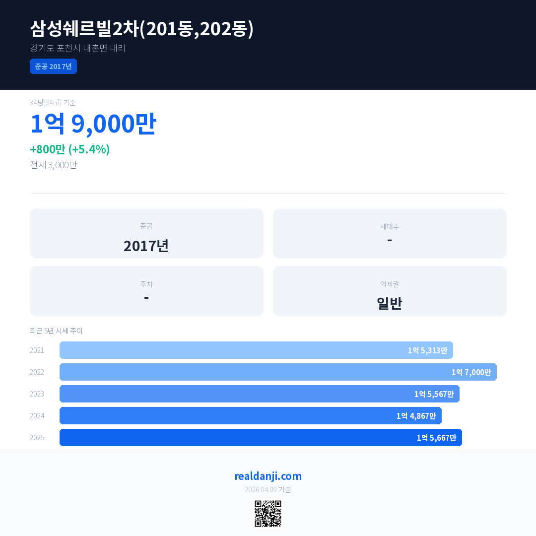 삼성쉐르빌2차(201동,202동) 최근 거래가는 1억 9,000만입니다. (2025-08)