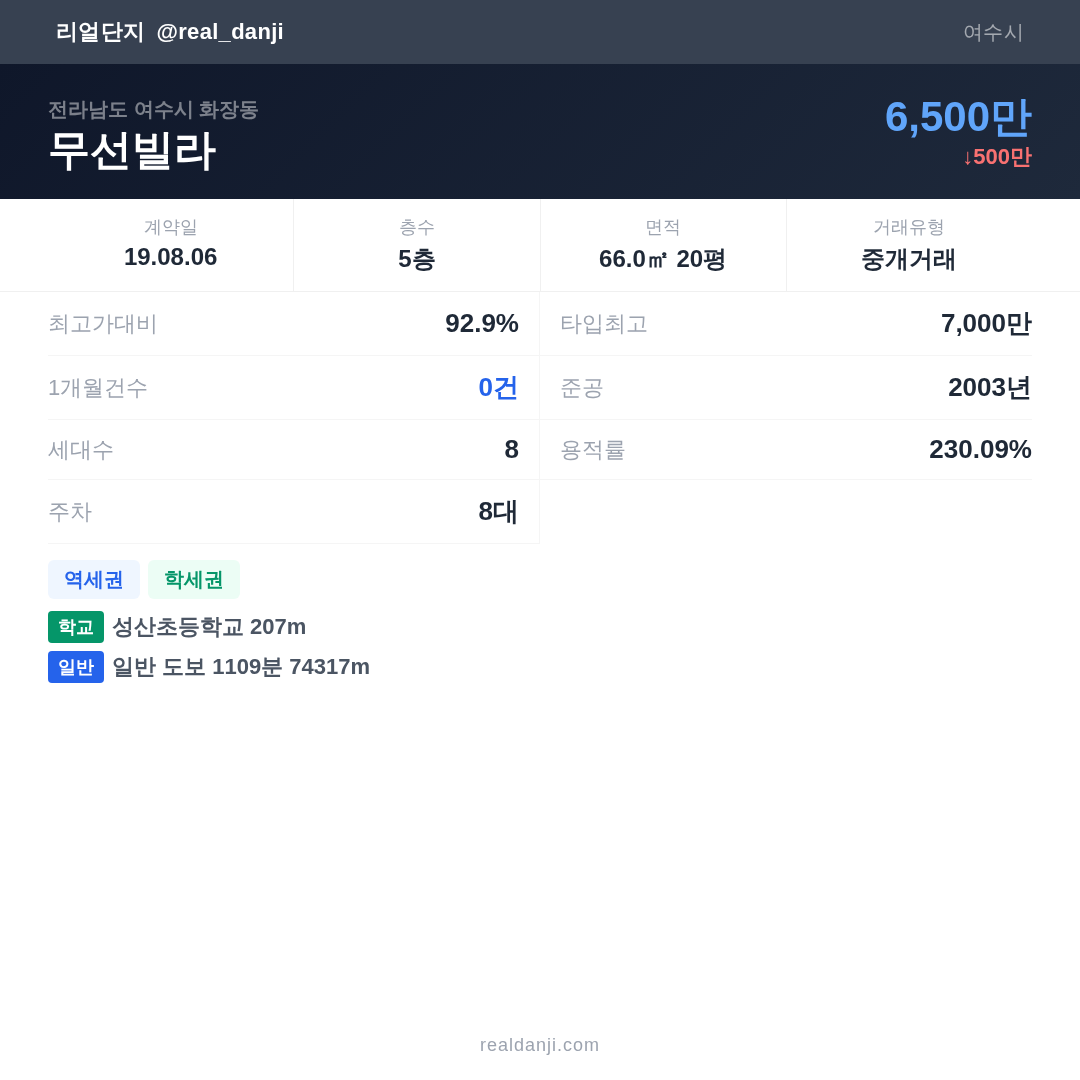 | 2019.08.06 | 66㎡ | 5층 | 6,500만 |